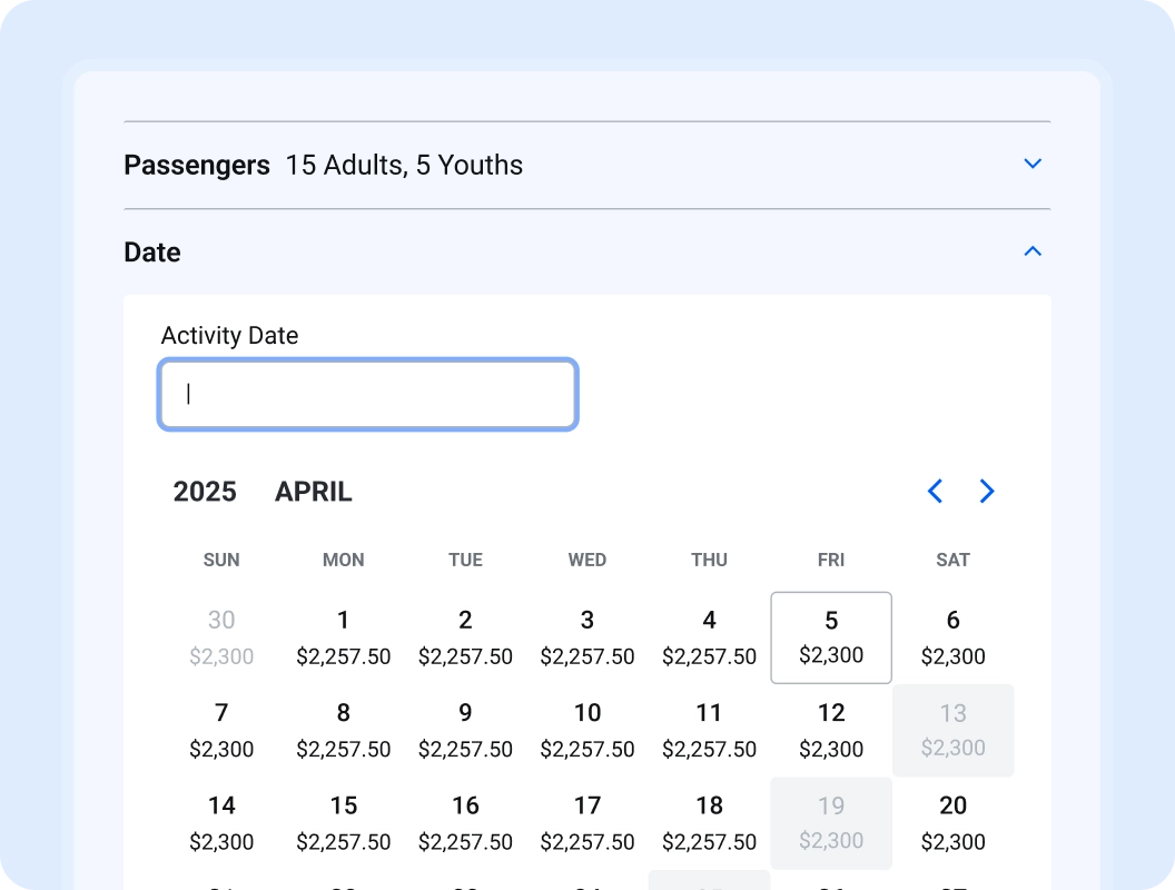 - There’s no need to navigate multiple screens or formssimply choose the date, time and activity, add guest details, and hit Add.