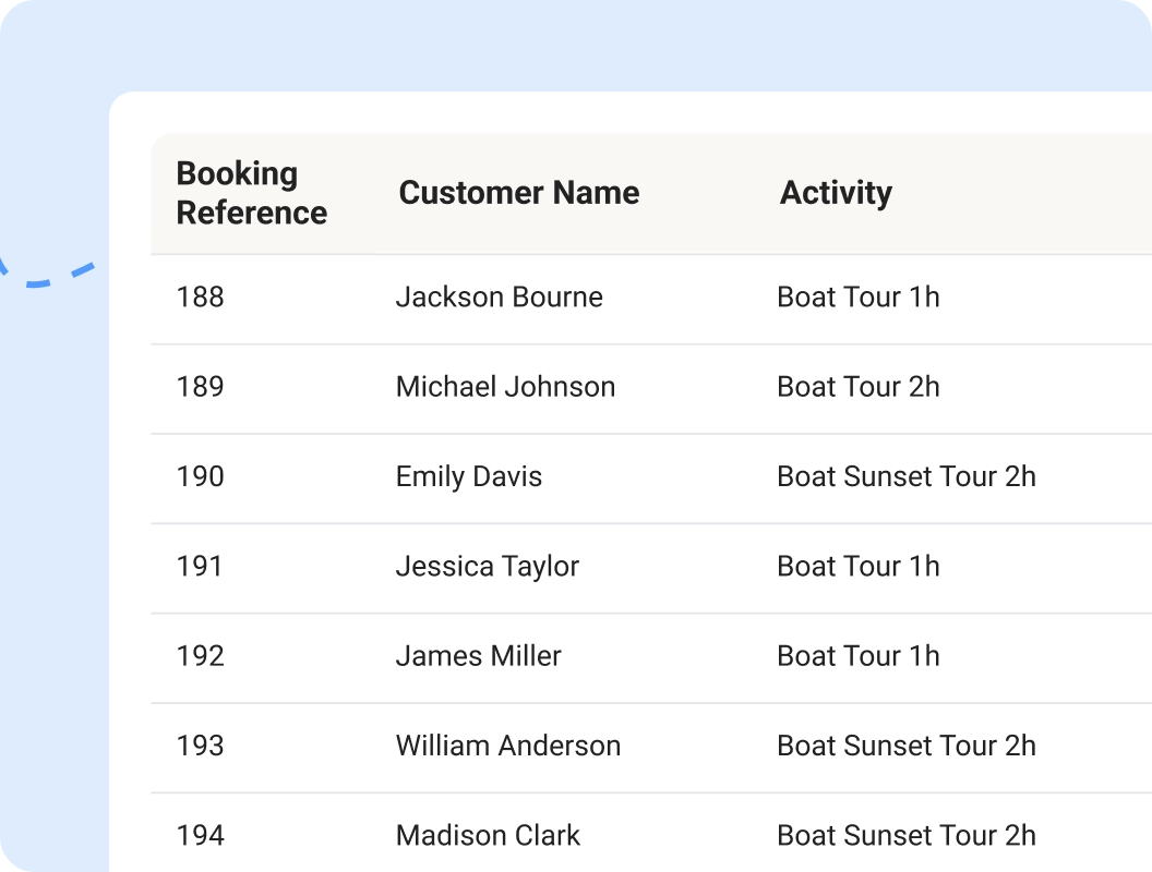- Quickly find existing bookings or customers by booking reference, activity name, customer name, email address, phone number, voucher number and more.