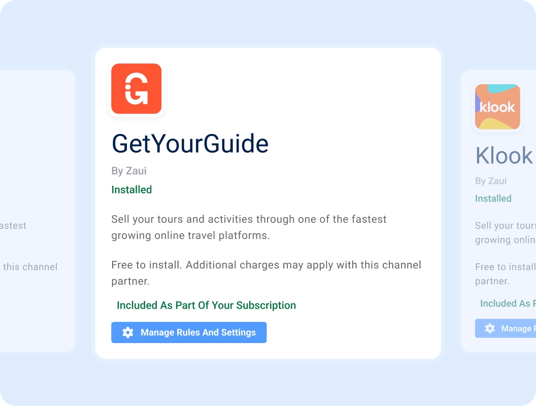 Zaui has direct integrations to 30+ major platforms like GetYourGuide, Viator (TripAdvisor Experiences), Google Things To Do and Expedia Local Expert. You can also connect to dozens of regional and niche resellers via API connections similar.