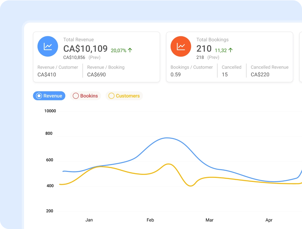 - Monitor bookings, revenue, and performance in real time with intuitive visual dashboards.