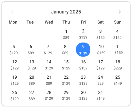 This feature allows customers to check availability for preferred dates, making it easier to plan their trips and ensuring they get the services they want at the times they need. For tour operators, it enables dynamically priced tour, as you can see the price difference between dates. The current date is always highlighted for easy reference.Sold-out and past dates are now marked with a slash instead of just a greyed-out number, making it clearer that they are unavailable. The calendar automatically updates the displayed price based on the number of selected passengers. For example, if one adult costs $100, selecting two adults will adjust the price to $200. This real-time pricing visibility helps users compare costs across different dates without extra clicks.