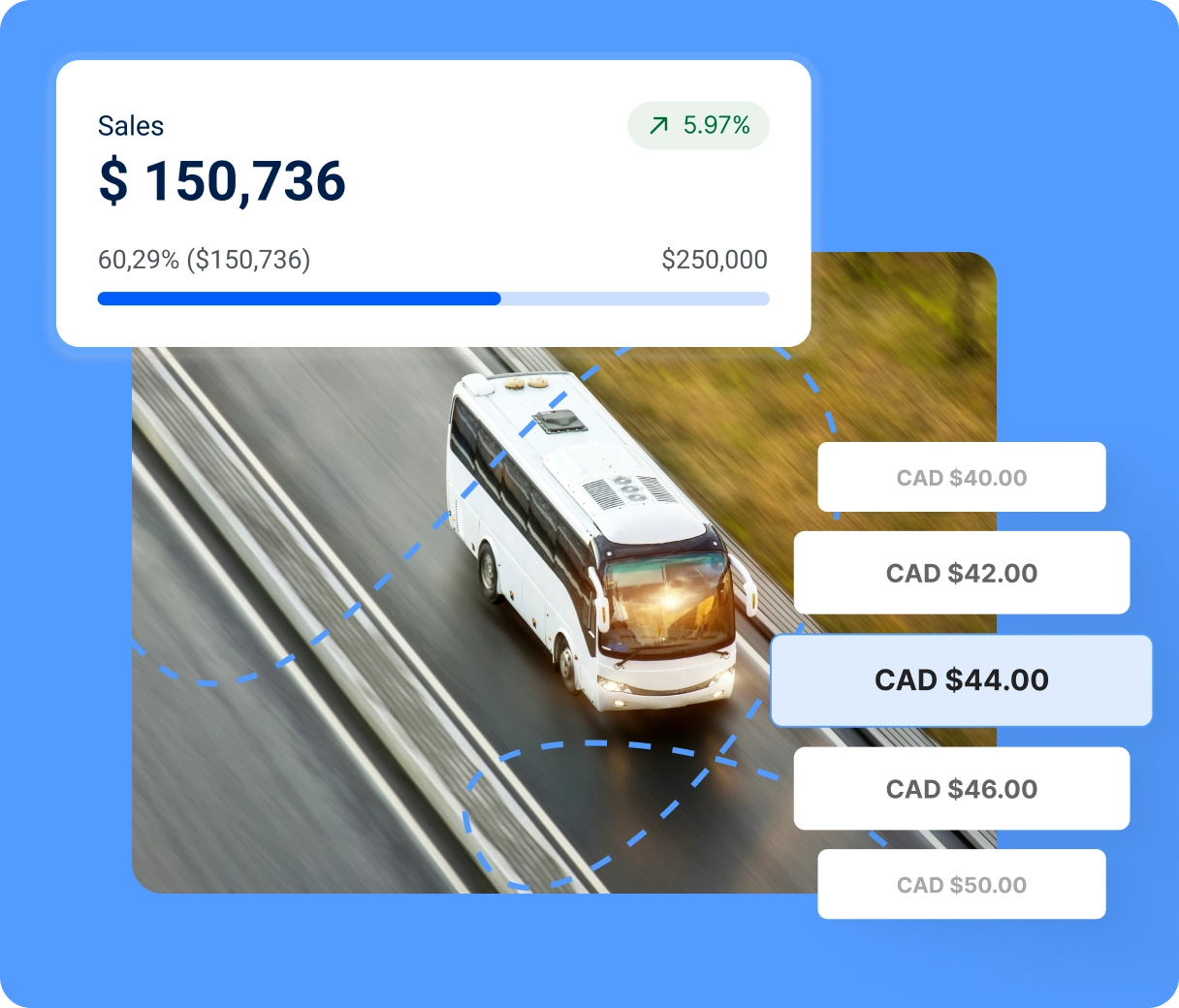 Build custom one‑way, round‑trip or multi‑stop charter itineraries; sell by vehicle or by group from a single inventory. - Flexible Pricing & Quoting